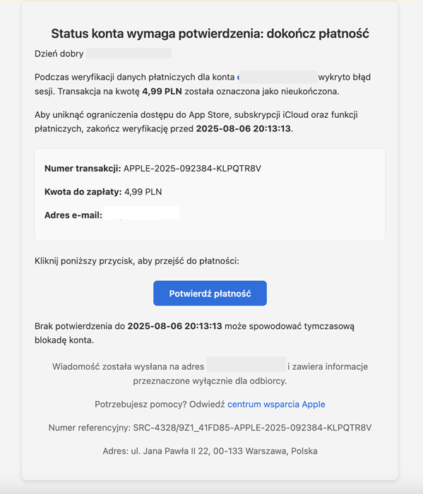 Wiadomość o długu może zmrozić krew w żyłach. Oszuści wysyłają komunikat odnośnie zaległej płatności związanej z Twoim kontem Apple. W związku z tym, żeby nie stracić dostępu, należy kliknąć w załączony link, zalogować się i dokonać drobnej opłaty przez podanie danych swojej karty płatniczej. Cała wiadomość wygląda bardzo wiarygodnie, w treści znajdziemy nawet numer referencyjny i numer faktury do opłacenia.