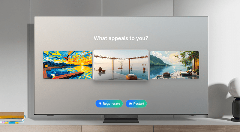 Telewizory Samsung to jednak nie tylko poważne tematy, ale także świetna zabawa! Masz zły nastrój i chcesz sobie poprawić humor? Z pomocą przychodzi Tapeta AI[5]. Wystarczy, że wybierzesz słowa kluczowe oddające pożądaną atmosferę, a Tapeta AI zajmie się resztą. Sztuczna inteligencja pomoże Ci stworzyć wspaniałe, jedyne w swoim rodzaju grafiki, które wypełnią nie tylko ekran, ale nadadzą wyjątkowy charakter wnętrzu.