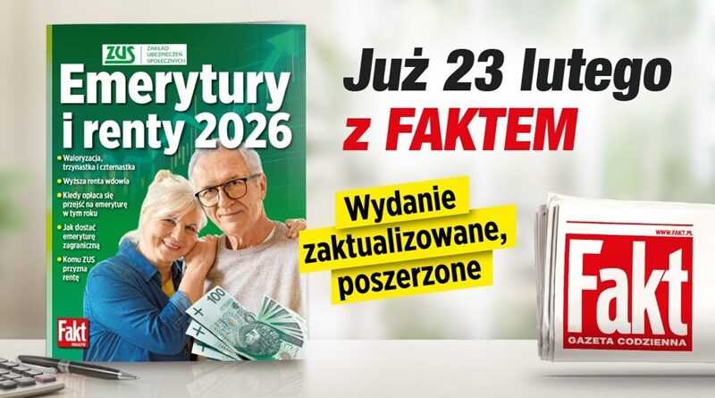 W poniedziałek 23 lutego w sprzedaży dostępny będzie dziennik „Fakt” z wydaniem specjalnym poradnika „Emerytury i renty 2026”, przygotowanym we współpracy z Zakładem Ubezpieczeń Społecznych. Dodatek zawiera m.in. aktualne wyliczenia emerytur i rent po waloryzacji oraz wyjaśnienia dotyczące aktualnych przepisów.