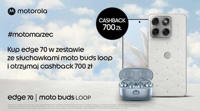 Oferta jest rozszerzeniem promocji „Cashbackowy motomarzec”, w której biorą udział wszystkie wersje kolorystyczne modelu motorola edge 70. Akcja promocyjna trwa od 1 do 31 marca 2026 roku. Aby otrzymać 700 zł cashbacku, najpóźniej do 8 kwietnia 2026 roku należy wypełnić formularz online dostępny na stronie cashback.motopromocja.pl – tam również można znaleźć regulamin oraz szczegółowe warunki akcji promocyjnej.