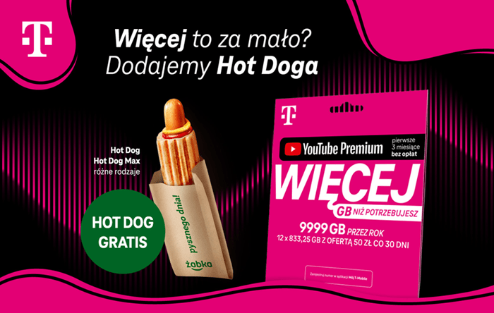 Najlepsze doświadczenia w T-Mobile nie mają ograniczeń. Jeżeli więc myślisz, że trzymiesięczna subskrypcja YouTube Premium bez opłat w T-Mobile na kartę, to za mało, mamy dla Ciebie niespodziankę. Teraz przy zakupie startera T-Mobile w każdym ze sklepów sieci Żabka otrzymasz także hot doga gratis!