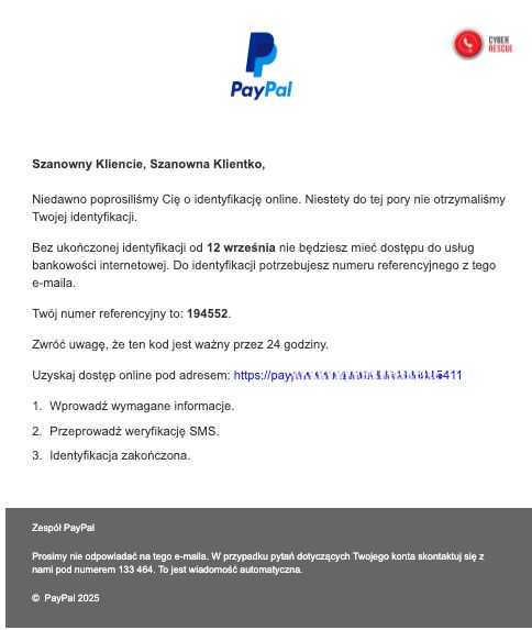 Z treści wynika, że rzekomo konieczne jest przeprowadzenie identyfikacji online, w przeciwnym razie, do wyznaczonego czasu utracimy dostęp do usługi. Podany jest też kod, który ma pozostać aktywny jedynie przez 24 godziny, a także link, który wygląda jakby miał prowadzić do oficjalnej strony PayPal, w rzeczywistości przekierowuje jednak na podrobioną stronę. Warto zwrócić też uwagę, że mail został wysłany z adresu, który nie ma związku z domeną PayPal — informuje Magdalena Dziegieć, młodsza specjalistka ds. cyberbezpieczeństwa.