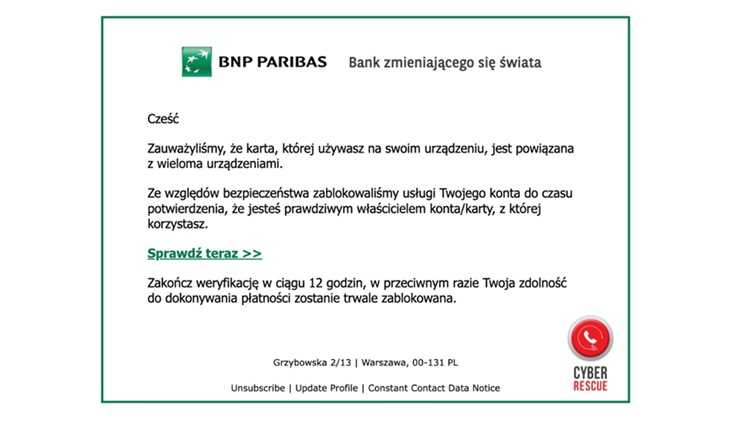 Tymczasem prawdziwy BNP Paribas nigdy nie wysyła takich maili i nie każe nikomu logować się do bankowości przez podejrzane linki.