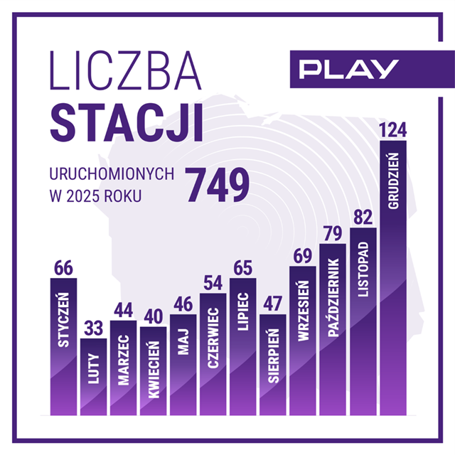 Grudzień 2025 roku okazał się wyjątkowo udany dla sieci Play. Operator uruchomił w tym czasie 124 nowe stacje bazowe telefonii mobilnej, co było najlepszym miesięcznym wynikiem w całym roku. Ostatni kwartał był najlepszym w całym ubiegłym roku łącznie powstało 285 stacji w tym okresie. A w całym świeżo minionym roku aż 749.