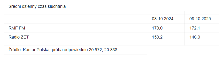 Radio RMF FM poprawiło także swój średni czas słuchania o ponad 2 minuty i jest słuchane w ciągu przeciętnego dnia przez 2 godziny i 52 minuty. To wynik lepszy niż u bezpośredniej konkurencji – o ponad 26 minut! Na ten wynik pracowały z jednej strony atrakcyjne audycje programowe (m.in. rozbudowana oferta podcastowa, formaty z gwiazdami, m.in. Jullycious Julii Wieniawy czy „Gwiazdy z Tańcami”, lubiany program tworzony we współpracy z kultowym telewizyjnym show, a także kolejny sezon programu „Genzie sami w RMF”), ale też m.in. finały Jesiennej SuperKumulacji w RMF FM, gdzie po raz pierwszy w polskiej radiofonii padła wygrana ponad 1,1 mln złotych. Nieustannie olbrzymia popularnością cieszą się też sztandarowe pozycje programowe jak „Wstawaj szkoda dnia”, czy „Lepsza połowa dnia”.