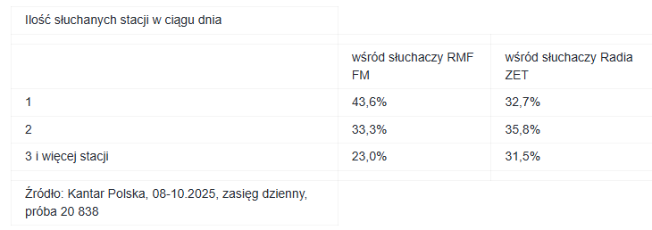 Radio RMF FM ma też zdecydowanie bardziej lojalnych słuchaczy niż Radio ZET. Niemal 44% słuchaczy w ciągu przeciętnego dnia słucha tylko tej stacji. Rok temu było to 43%. Radia ZET słucha wyłącznie niecałe 33% słuchaczy.