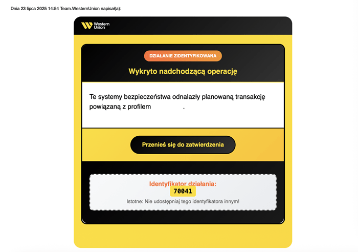 Cyberprzestępcy znów próbują wyłudzić dane, tym razem podszywając się pod znaną firmę transferującą pieniądze – Western Union. Na pierwszy rzut oka wszystko wygląda autentycznie, ale nic bardziej mylnego! Chwila nieuwagi może przynieść fatalne skutki.