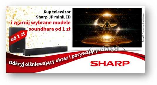 W okresie przedświątecznym pojawiło się wiele przedświątecznych promocji z produktami Sharp, dzięki którym klienci mogą stworzyć swoje wymarzone centrum rozrywki domowej. Wśród ofert znalazły się m.in. bezprzewodowe tylne głośniki w prezencie, soundbary dostępne od 1 zł, a także stylowy gramofon z kolumnami za symboliczną złotówkę. Wszystkie akcje dostępne są u największych partnerów: Media Expert, Media Markt i RTV Euro AGD.