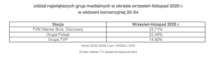 W okresie wrzesień-listopad 2025 r. grupa TVN Warner Bros. Discovery utrzymała pozycję lidera, osiągając udział na poziomie ponad 22,7% w grupie komercyjnej.