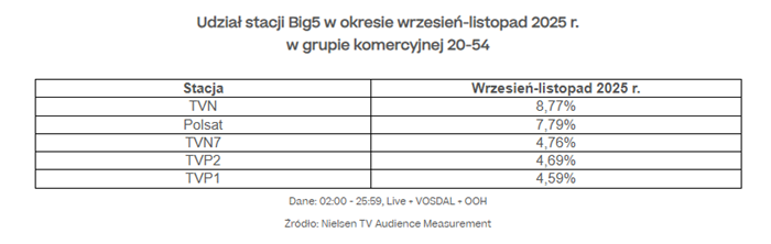 – W okresie wrzesień–listopad 2025 r. Grupa TVN Warner Bros. Discovery zachowała pozycję lidera, osiągając 22,7% udziału w widowni komercyjnej.