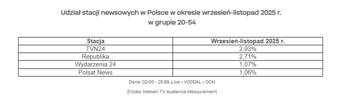– TVN24 utrzymał pozycję lidera stacji newsowych z udziałem blisko 3% w grupie komercyjnej.