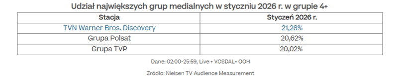 W styczniu 2026 r. grupa TVN Warner Bros. Discovery utrzymała pozycję lidera, osiągając udział na poziomie 21,3% w grupie wszystkich widzów oraz 22,3% w grupie komercyjnej (ex aequo z grupą Polsat).