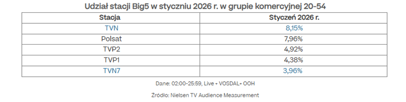 W styczniu 2026 r. oferta programowa kanału TVN zdominowała konkurencję. W grupie komercyjnej stacja osiągnęła udział na poziomie blisko 8,2%, tym samym utrzymując prowadzenie w zestawieniu Big5 w widowni docelowej, czyli tradycyjnie największych stacji. Imponujące wyniki osiągnął również kanał TVN7, który zanotował udział na poziomie 4% w widowni komercyjnej.