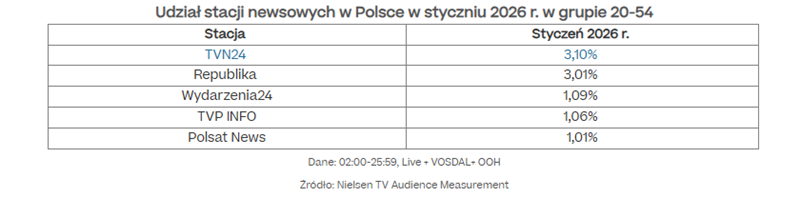 Wyniki z minionego miesiąca potwierdzają niekwestionowaną dominację stacji newsowych TVN Warner Bros. Discovery. W styczniu 2026 roku „Fakty” utrzymały pozycję lidera wśród serwisów informacyjnych w grupach docelowych. Na obu kanałach, na których emitowano program – TVN i TVN24 BiS – łączny udział sięgnął blisko 21,7% w widowni komercyjnej oraz 21,9% w grupie wszystkich widzów.