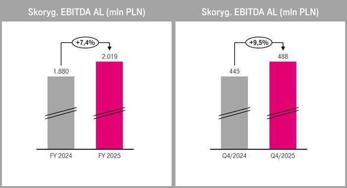 • Zwiększył zysk EBITDA AL zarówno w ujęciu kwartalnym, jak i w skali całego roku. W ostatnim kwartale 2025 r. EBITDA AL zwiększyła się o 9,5%, co przełożyło się na mocny wynik roczny na poziomie 7,4%;