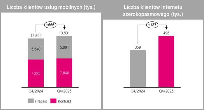 Na koniec 2025 r. baza klientów mobilnych T-Mobile liczyła 13,5 miliona, co oznacza wzrost o 666 tysięcy rok do roku. Ważnym elementem składającym się ten wynik był dynamiczny rozwój segmentu postpaid, w którym operator pozyskał dodatkowe 315 tysięcy nowych abonentów, potwierdzając skuteczność strategii w tym obszarze. W 2025 r. T-Mobile konsekwentnie inwestowało w jakość świadczonych usług. Rozszerzenie zasięgu stacjonarnego dostępu do sieci do niemal 11 milionów gospodarstw domowych – co stanowi ok. 70% wszystkich gospodarstw domowych w Polsce – umożliwiło firmie zwiększenie tempa sprzedaży usług stacjonarnych i dotarcie z ofertą szerokopasmową do blisko 500 tysięcy klientów, co oznacza wzrost o 40% w porównaniu do końca ubiegłego roku.