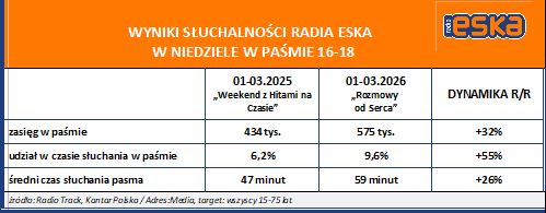 Średni czas słuchania niedzielnego pasma 16-18 to w 1. kwartale br. 59 minut (wzrost o 26%).