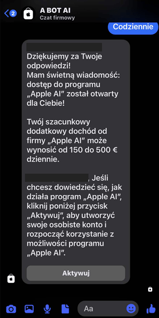 Scenariusz jest prosty, ale skuteczny. W internecie pojawiają się reklamy, rzekomo związane z Apple, promujące „rewolucyjnego” bota AI do inwestycji. Kliknięcie w reklamę nie prowadzi do strony internetowej, lecz bezpośrednio do rozmowy przez Messenger. Takie konta powstają najczęściej ze skradzionych, wiarygodnych fanpage’ów firmowych (stąd „Czat firmowy”), co utrudnia wykrycie oszustwa przez administrację.