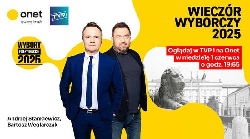 Już w niedzielę, 1 czerwca 2025 roku o godzinie 21.00 prawdopodobnie dowiemy się, kto zostanie nowym prezydentem RP. Telewizja Polska przygotowuje na tę wyjątkową okazję wieczór wyborczy, który ponownie realizuje z Onetem. Gospodarzami wieczoru będą Joanna Dunikowska-Paź i Marek Czyż z TVP oraz Andrzej Stankiewicz z Onetu. Wyniki na gorąco skomentują m.in. Aleksander Kwaśniewski i Bronisław Komorowski. Transmisja w TVP1, TVP Info (i serwisie tvp.info), TVP Polonia, TVP VOD oraz na stronie głównej Onetu. Drugi w tym roku „Wieczór wyborczy Telewizji Polskiej i Onetu” rozpocznie się w niedzielę, 1 czerwca o 19.55 w TVP Info.