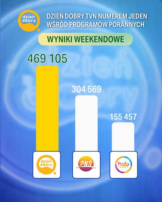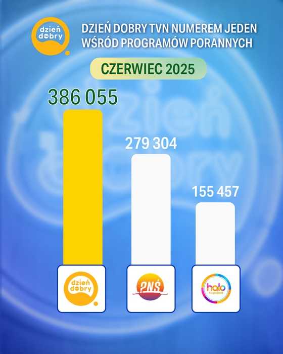 W czerwcu niezmiennie najchętniej oglądanym przez widzów programem porannym był “Dzień Dobry TVN”. Wydania śledziło średnio ponad 386 tysięcy osób. Przełożyło się to na 8,3% udziału w grupie ogólnej, 10,7% wśród widzów w wieku 20-54 i 9,4% w grupie wiekowej 16-49.