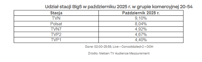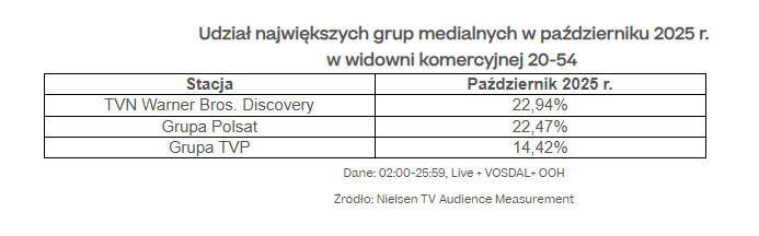 W październiku 2025 r. grupa TVN Warner Bros. Discovery utrzymała pozycję lidera, osiągając udział na poziomie ponad 22,9% w grupie komercyjnej.