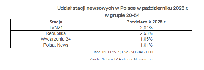 Wyniki z minionego miesiąca potwierdzają niekwestionowaną dominację stacji newsowych TVN Warner Bros. Discovery. W październiku 2025 roku „Fakty” utrzymały pozycję lidera wśród serwisów informacyjnych w obu grupach docelowych. Na obu kanałach, na których emitowano program – TVN i TVN24 BiS – łączny udział osiągnął poziom blisko 20,2% w widowni komercyjnej oraz prawie 20,1% w grupie wszystkich widzów. W październiku 2025 r. TVN24 utrzymał pozycję lidera w widowni komercyjnej, notując udział na poziomie ponad 2,8%. W grupie wszystkich widzów kanał osiągnął udział na poziomie ponad 4,5%.