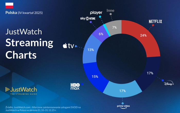 Następnie: Prime Video (17%), HBO Max (15%), Apple TV+ (13%), Sky Showtime (6%), Player (1%), oraz inne serwisy (7%).