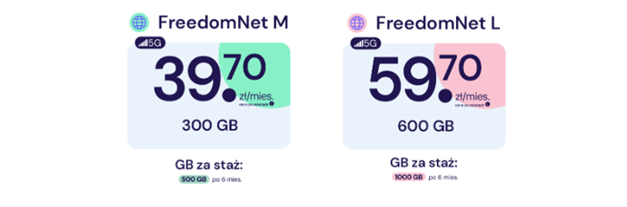 Operator PremiumMobile oferuje również abonamenty z internetem mobilnym 5G. Zasady są tu podobne – obowiązują gigabajty za staż (500 GB po 6 miesiącach we FreedomNET M i 1000 GB po 6 miesiącach we FreedomNET L), umowa z 1-miesięcznym okresem wypowiedzenia i kolejny abonament w wysokości 20,70 zł/mies., z tą różnicą, że klient płaci pełną kwotę za internet mobilny, a rabatowany jest dobrany abonament na telefon i/lub kolejny internet mobilny 5G.