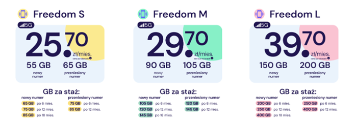Operator PremiumMobile przez wszystkie lata swojego istnienia zdążył już przyzwyczaić klientów do prostych zasad i niskich cen. W swojej nowej ofercie dostępnej od 9 kwietnia nadal oferuje elastyczną umowę z 1-miesięcznym okresem wypowiedzenia, a wraz z nią nowe abonamenty Freedom z ogromną ilością internetu na start, która rośnie co pół roku osiągając poziom od 85 GB miesięcznie (w abonamencie Freedom S za 25,70 zł/mies.) do nawet do 400 GB miesięcznie (w abonamencie Freedom L za 39,70 zł/mies.).