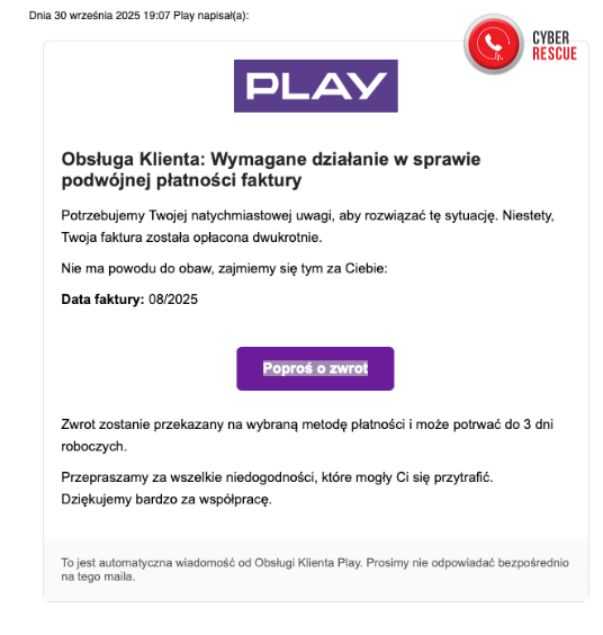 Cyberprzestępcy tym razem podszywają się pod operatora Play, rozsyłając fałszywe wiadomości e-mail dotyczące rzekomej „podwójnej płatności za faktury”. Celem kampanii jest nakłonienie odbiorców do kliknięcia linku prowadzącego na fałszywą stronę internetową.