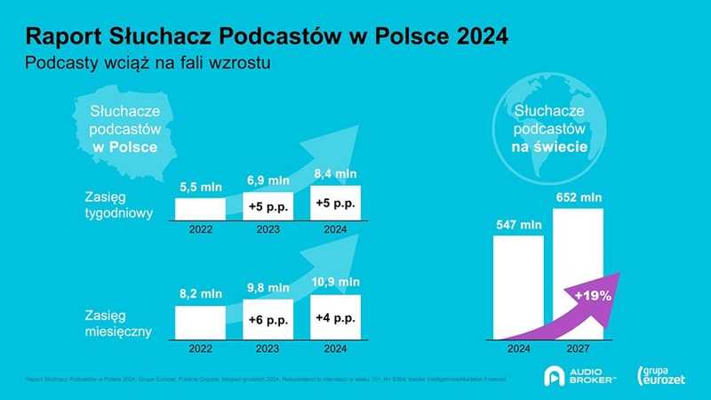 Rynek audio w Polsce dynamicznie rośnie, a jego tempo zbliża się do trendów obserwowanych na Zachodzie. Już 8,4 miliona Polaków słucha podcastów co tydzień, a miesięczny zasięg sięga niemal 11 milionów – wynika z szóstej edycji badania „Słuchacz podcastów w Polsce” przygotowanego przez Grupę Eurozet we współpracy z Publicis Groupe. Raport podsumowuje zmiany rynkowe i rozwój podcastów w naszym kraju i jest jedynym cyklicznym pomiarem rynku podcastowego, który umożliwia śledzenie trendów podcastowych w Polsce.