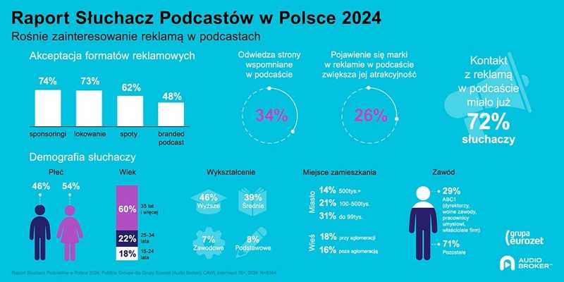 Odbiorcy podcastów w Polsce to duża, atrakcyjna grupa dla reklamodawców. Większość z nich to kobiety, osoby w wieku powyżej 35 lat, posiadające średnie lub wyższe wykształcenie, mieszkańcy miast, a do tego reprezentujący atrakcyjne komercyjnie grupy zawodowe. Co więcej wśród słuchaczy niezmiennie występuje wysoka akceptacja dla reklam pojawiających się w podcastach. To kolejne wnioski płynące z raportu „Słuchacz podcastów w Polsce 2024” przygotowanego przez analityków Grupy Eurozet we współpracy z Publicis Groupe.