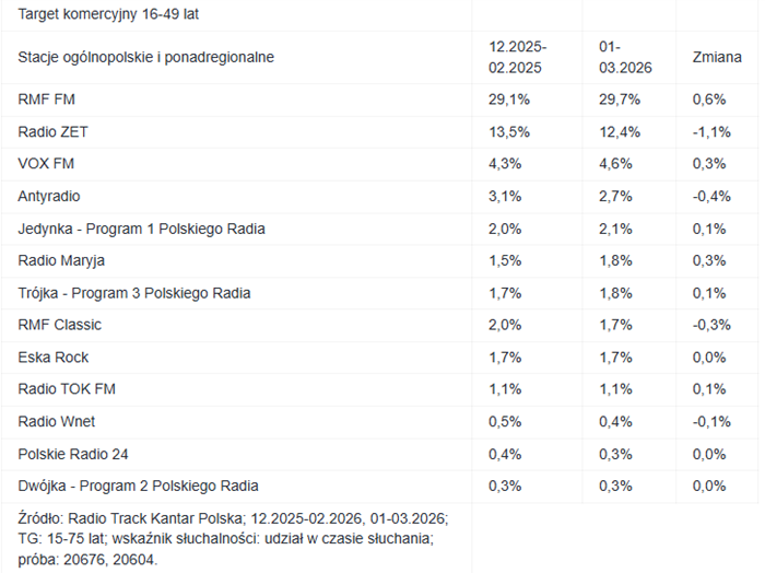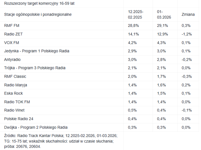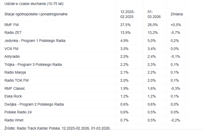 Najnowsza fala badań Radio Track (styczeń-marzec 2026) przynosi wzrost udziału w czasie słuchania Radia RMF FM w stosunku do poprzedniej fali badawczej (grudzień 2025-luty 2026). Stacja posiada teraz 28,0 proc. udziału, w poprzedniej fali wyniki był 0,5 proc. niższy.