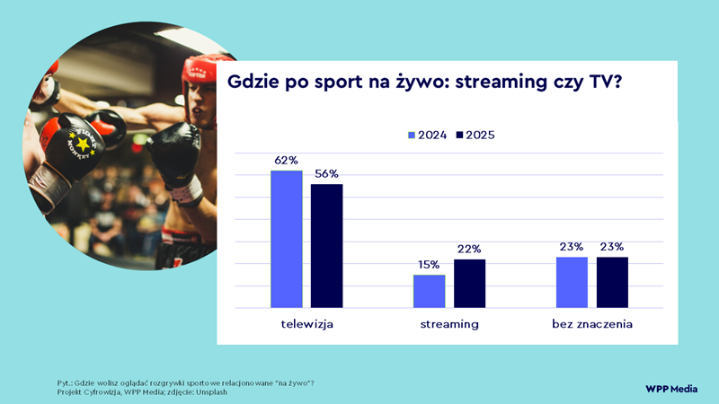 Wśród programowych ‘wabików’ tym najważniejszym, z przewagą nad newsami i filmem, pozostają kanały sportowe. Jako segment stacji tematycznych od lat utrzymują one stabilny udział w oglądalności. Jednak Projekt Cyfrowizja 9 dokumentuje ewolucję podejścia widzów do oglądania sportu na żywo. W ub.r. jeszcze blisko 2/3 widzów obstawało przy telewizji jako medium, w którym wolą ogladać rozgrywki live. W 2025 r. tym roku prymat TV lekko stopniał na rzecz streamingu, gdzie obecnie niemal co czwarty polski widz woli oglądać sport na żywo.