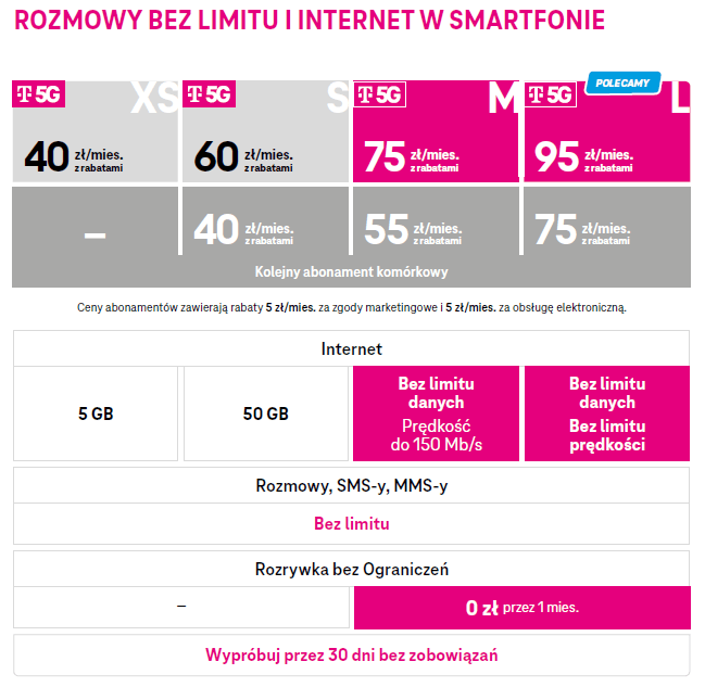 Więcej informacji o ofercie abonamentowej T-Mobile można znaleźć na stronie https://www.t-mobile.pl/sklep/oferta/abonament.