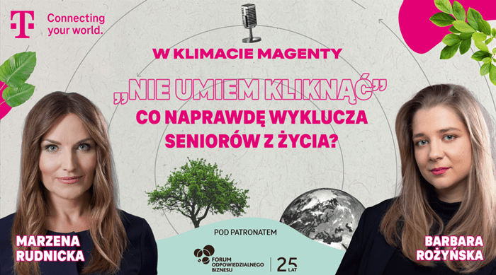 W najnowszym odcinku Barbara Rożyńska, główna specjalistka ds. komunikacji korporacyjnej i ESG w T-Mobile, która prowadzi podcast, rozmawia z Marzeną Rudnicką – ekspertką, która od lat działa na rzecz włączenia seniorów w cyfrową rzeczywistość. Zastanawiamy się w nim m.in. dlaczego 1/4 Polaków wciąż pozostaje poza cyfrowym światem; czy naprawdę chodzi tylko o wiek – czy raczej o brak cierpliwości i systemowych rozwiązań; jak dostosować rozwój technologii do starzejącego się społeczeństwa?
