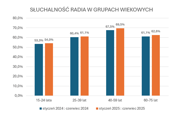 W omawianym okresie wzrost słuchalności radia widoczny jest we wszystkich grupach wiekowych. Wśród osób w wieku od 40 do 59 lat radia słuchało 69,5 proc., co stanowi wzrost o 2 pkt proc. w porównaniu do pierwszego półrocza roku poprzedniego. W grupie 60-75 lat – 62,6 proc. (wzrost o 1,5 pkt proc.); w grupie 25-39 lat – 61,1 proc. (wzrost o 0,7 pkt proc.). Tendencja wzrostowa widoczna jest także w grupie najmłodszych badanych, czyli osób w wieku od 15 do 24 lat: 54 proc. w I półroczu 2025 wobec 53,3 proc. w I półroczu 2024.