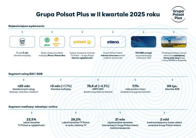 W II kw. br. Grupa Polsat Plus zanotowała wzrosty wyników finansowych i operacyjnych. Przychody zwiększyły się do 3,6 mld zł, a liczba klientów multiplay – do ponad 3 mln. Grupa wprowadziła nową, niezwykle elastyczną i prostą ofertę usług łączonych. Wiosenna ramówka TV Polsat miała bardzo dobrą oglądalność. Grupa Polsat-Interia pozostawała liderem wśród wydawców online. Grupa wyprodukowała 314 GWh zielonej energii z własnych OZE i pozyskała finansowanie projektowe w wysokości do 953 mln zł na farmę wiatrową Drzeżewo.